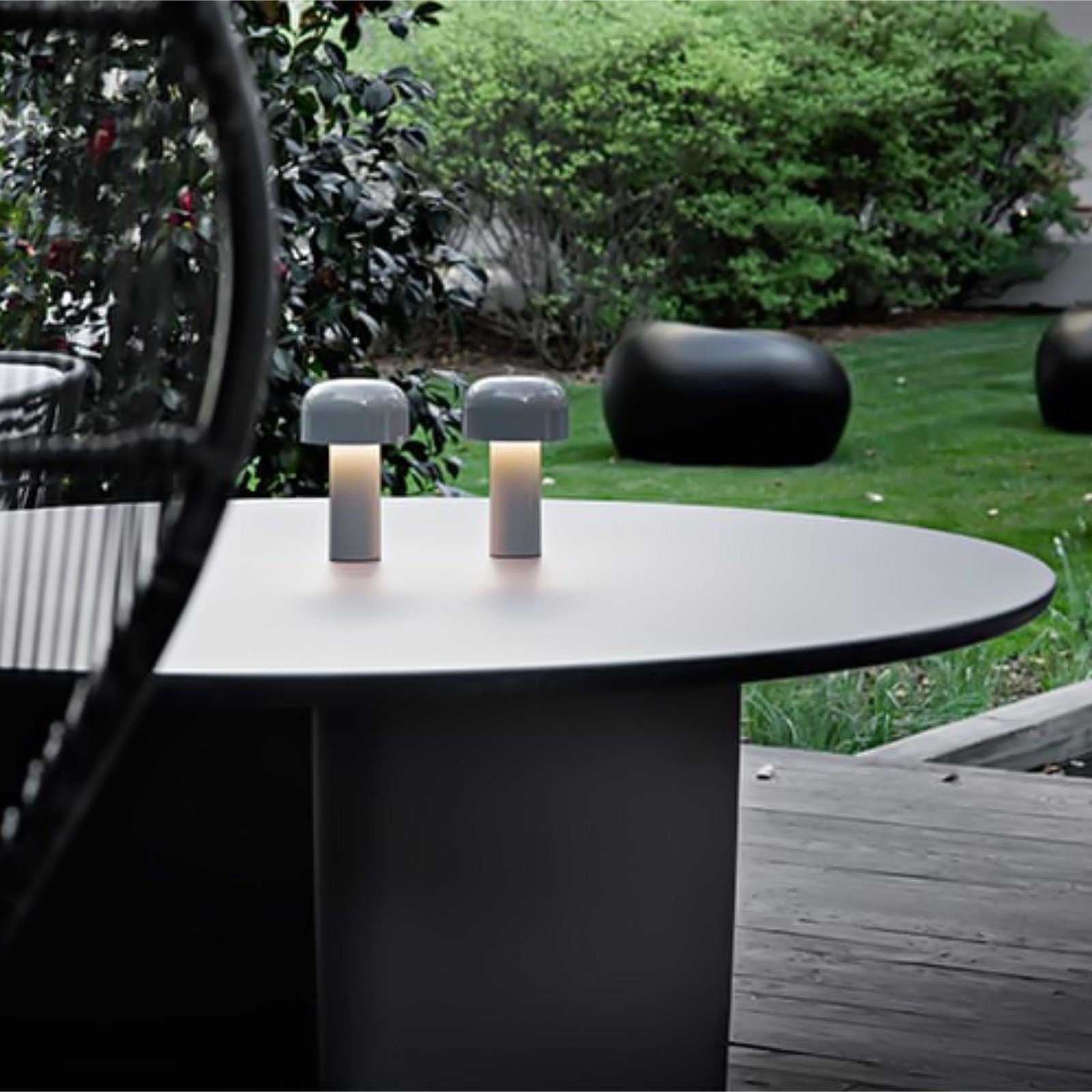 Rechargeable direct light table lighting device. Base and dome in colored PC. Diffuser in Opaline injection molded photo-engraved PC. 24-hours’ autonomy, charging via Micro-USB-C. Push-button switch positioned on the base provides the 4-step dimmer function. Battery status indicator positioned under the base. USB-C charging cable included, useful length 120cm. USB battery charging on plug with interchangeable plugs.