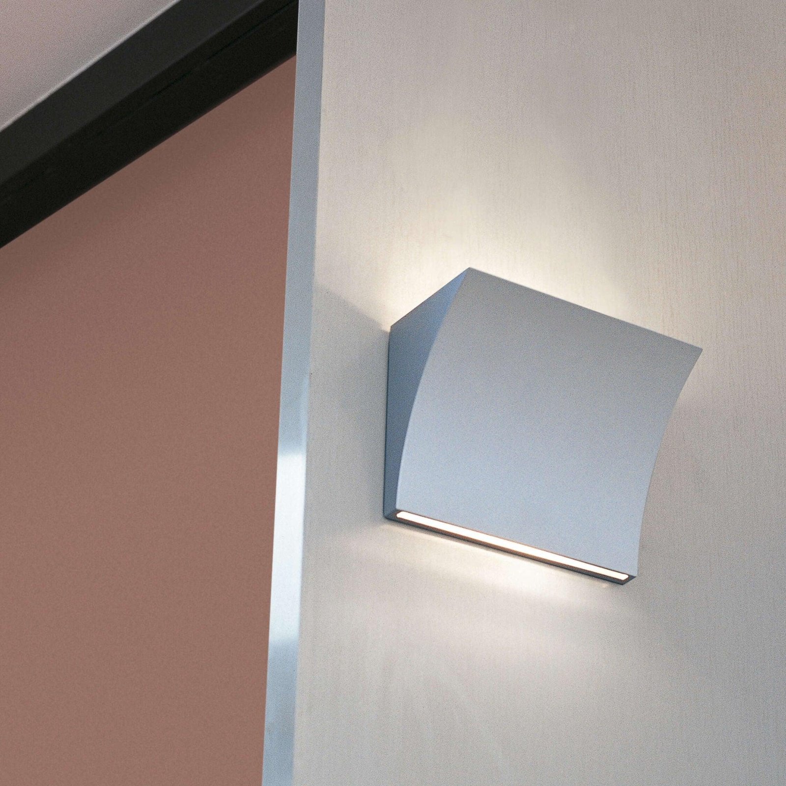Wall lamp providing direct/indirect light. Pressure die-cast Zamak alloy structure, matte gray, shiny white or chrome plated finish. Molded steel, galvanized white wall attachment containing the wall attachment system as well as the electrical devices.